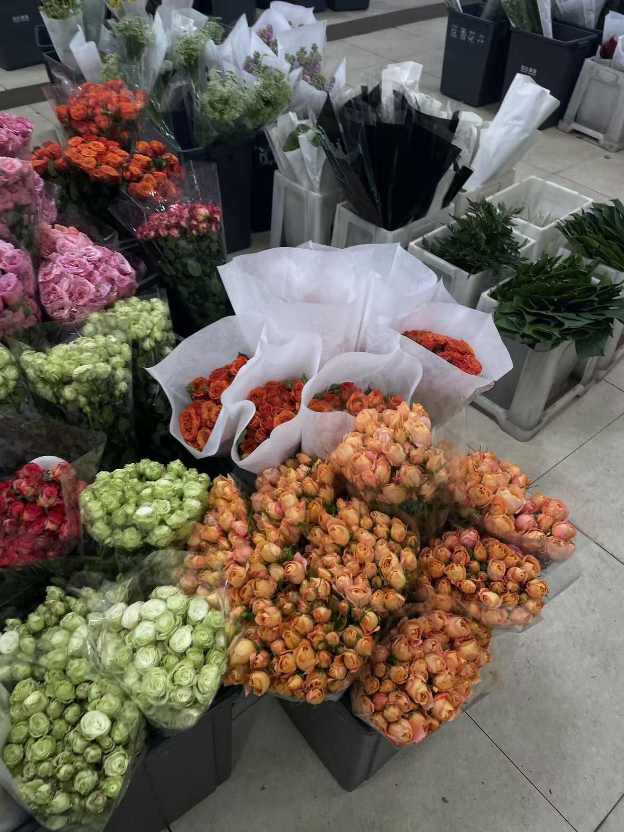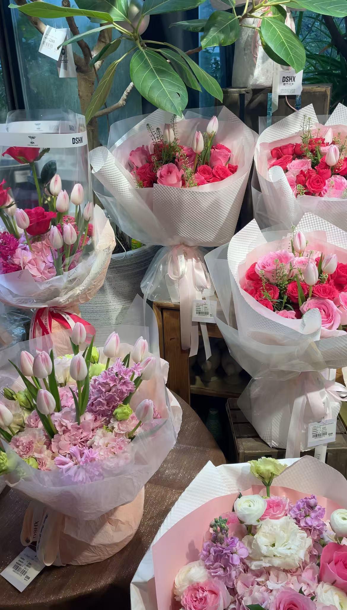 记者又来到了位于德思勤的都市花乡,相比于批发市场,这里的人气明显旺了不少,店里七八名员工正在马不停蹄地包装花束,“现在买花如果要包装,需要排队。”店里一名工作人员告诉记者。